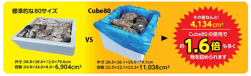 従来の一般的な80サイズ発泡スチロールと比べ約1.6倍の収納が可能